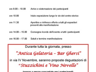 La manifestazione avrà inizio alle ore 10.00 e si protrarrà fino al pomeriggio. Collateralmente in via IV Novembre, durante tutta la giornata, saranno proposte degustazioni di “Vino Novello”.