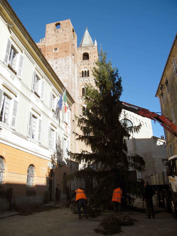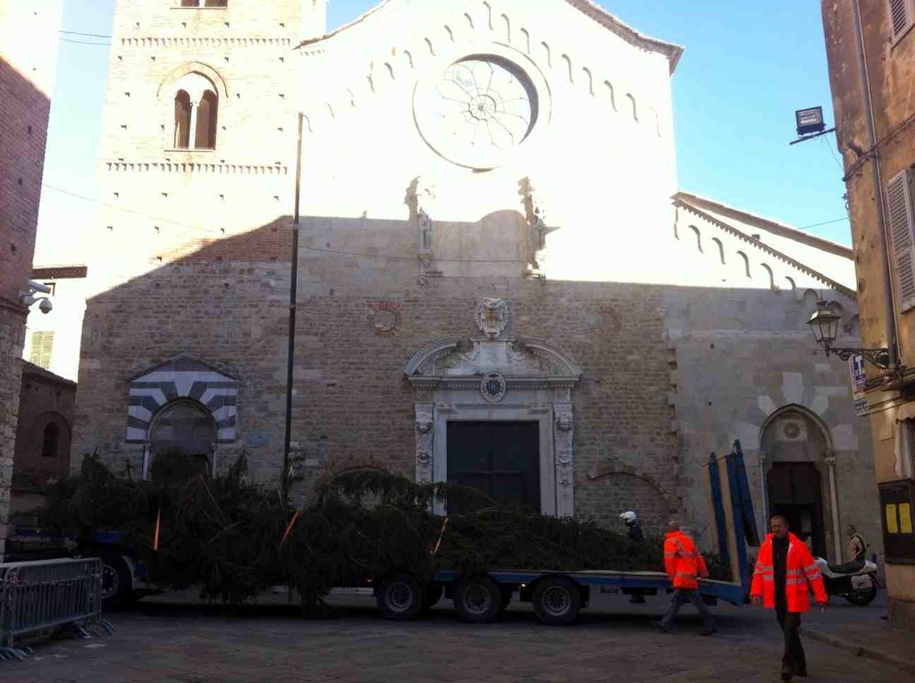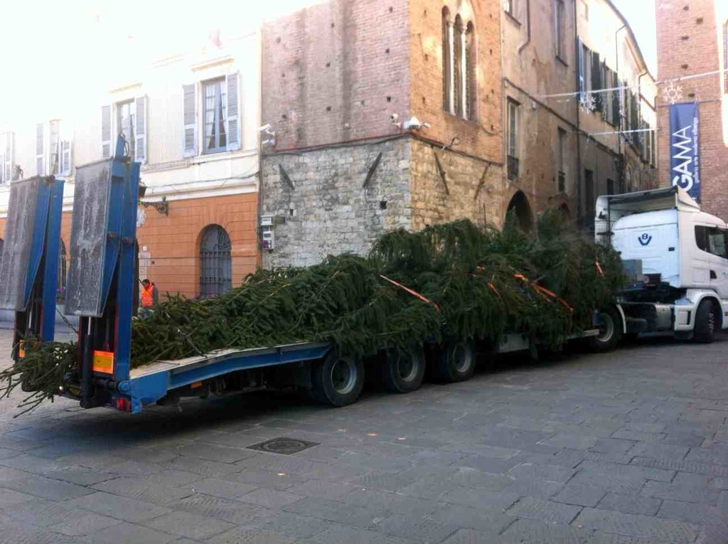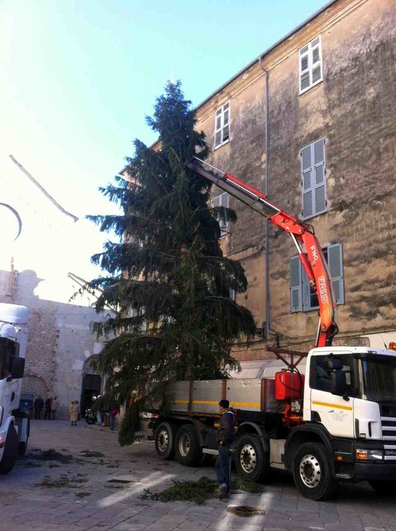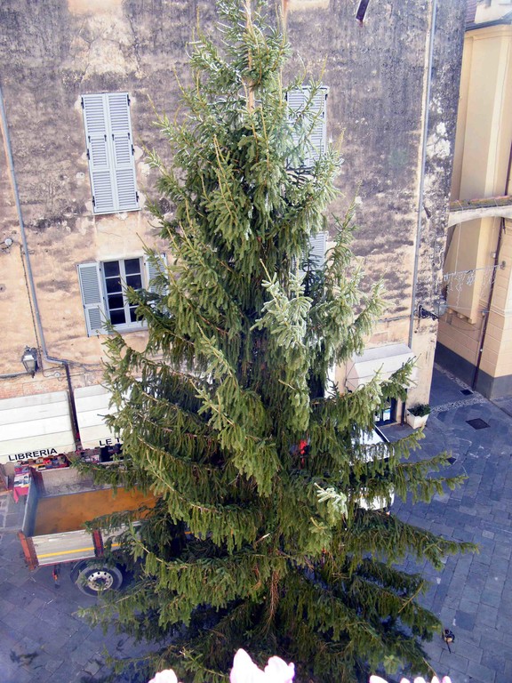 A grande richiesta, dopo il successo riscosso nel 2010 e nel 2011, in seguito ad anni di assenza, anche questo dicembre è tornato l'albero di Natale di Piazza San Michele ad Albenga. Questa mattina, trasportato su un autotreno e scortato da due motociclette della Polizia Municipale, è giunto nel Centro Storico. Personale del Settore Servizi Generali e del Settore Ambiente, sotto la supervisione del Funzionario Responsabile Giuseppe Marchese e dell'Assessore all'Ambiente Guido Lugani, ha provveduto a installarlo al centro della piazza.