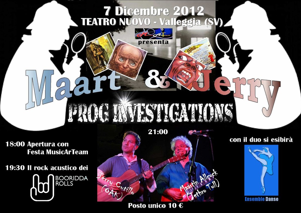 Venerdì 7 dicembre l’Associazione MusicArTeam festeggia il suo primo compleanno con una intensa giornata all’insegna della musica. Infatti farà tappa al Teatro Nuovo di Valleggia Maart & Jerry Prog Investigations, il nuovo spettacolo di due polistrumentisti ben noti nel panorama internazionale della musica folk/prog: Jerry Cutillo (Oak) Maartin Allcock (Jethro Tull).