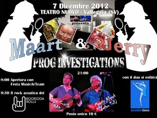 La serata parte alle ore 18.00 con la Festa MusicArTeam, a cura dell'omonima associazione che organizza l'evento, con aperitivo a buffet. Alle 19.30, concerto acustico della rock band locale Booridda Rolls. Alle 21.00, il clou con Maart & Jerry Prog investigations: sul palco salgono Jerry Cutillo e Maartin Allcock.
