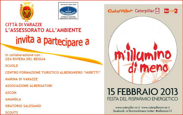 L’Assessorato all’Ambiente della città di Varazze aderisce al progetto “M’illumino di meno 2013”, la Giornata del Risparmio Energetico lanciata dalla trasmissione radiofonica Caterpillar, su RAI Radio 2, che si celebra venerdì 15 febbraio 2013. Un’iniziativa che, insieme e con la collaborazione di più realtà cittadine, cercherà di sensibilizzare tutti sui temi del risparmio energetico e su forme di energia alternativa, compatibili con uno sviluppo realmente sostenibile per il nostro pianeta.