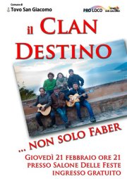 Giovedì sera, dalle ore 21.00, al Salone delle Feste, ci sarà una serata di grande musica con il complesso CLAN DESTINO che presenterà lo spettacolo "Non solo Faber ..." una serie di canzoni di Fabrizio De Andrè e di altri cantautori italiani.