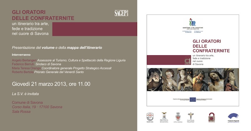 In volume rappresenta un viaggio nei vari oratori della città della Torretta: insieme al libro, anche una mappa con gli orari di apertura degli oratori e l'itinerario da seguire per andare alla scoperta di questi affascinanti luoghi. Il percorso che si snoda nel cuore della città alla scoperta dello straordinario patrimonio delle confraternite savonesi, costituisce una tappa del complesso e articolato progetto “Itinerario dei patrimoni accessibili” (Accessit) del programma comunitario Italia Francia Marittimo, di cui la Regione Liguria è partner.