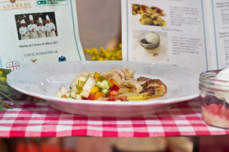 Per i secondi spaziamo dal mare all’entroterra: chi abitava infatti nelle vallate più interne raramente aveva l’occasione di gustare pesce, che diventava quindi il piatto simbolo delle feste, accompagnato da verdure fresche raccolte nelle fascie. La “budriga” (rana pescatrice) veniva pescata con le reti a sciabica, tecnica oggi vietata, dalla riva e la sua carne senza spine e la sua versatilità ne hanno decretato ben presto il successo, mentre i polipetti derivano da “Ginchetto, ü pescau de Varigotti” che “raccolse” in mare dei polpi piccoli e li chiamò moscatelli.