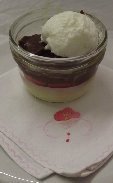 Il team cuochi presenta: “Crema ingreisa e pasta dusse zeneise cun-ne Sc-ciumette” (Zuppa inglese con crema a due colori e pasta genovese al profumo di rosolio con schiumette o meringhe alla ligure) e come accompagnamento “Na-stissa de Bice” (Un goccio di passito di Pigato “Bice”). Ricetta: - schiumette: 4 albumi montati a neve soda con zucchero tpt, vanillina. Bollire la meringa in mezzo litro di latte intero e mezzo litro d’acqua, aromatizzati con zeste di pernambuco. Appena galleggia, schiumare e fare sgocciolare; - crema inglese: portare il latte rimasto dalla cottura delle meringhe nuovamente a mezzo litro e, con 2 tuorli, 30 gr di Farina, 50 gr di Zucchero, vanillina, realizzare la crema inglese e dividerla in due parti, ad una delle quali vanno aggiunti 30 gr di cacao amaro; - biscotto di pasta genovese: 2 tuorli, 50 gr di Zucchero, 100 gr di Farina, vanillina, Alkermes o rosolio.