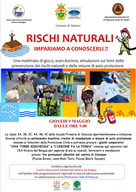 Giovedì 9 maggio, a partire dalle 9:00, si svolgerà a Varazze "Rischi naturali: impariamo a conoscerli!", una mattinata di gioco, esercitazioni, simulazioni sui temi della prevenzione dei rischi naturali e delle misure di auto protezione.