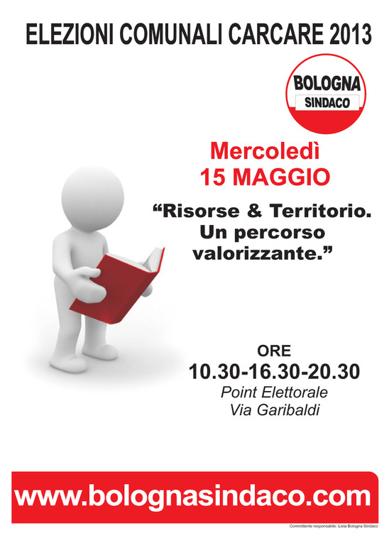 Mercoledì 15 maggio, nei consueti tre orari, alle ore 10.30 la mattina, alle ore 16.30 il pomeriggio, e alle ore 20.30 la sera, nel point elettorale di via Garibaldi, il candidato sindaco Franco Bologna insieme ai componenti della Lista Bologna svilupperanno alcuni punti programmatici sul tema "Risorse & Territorio. Un percorso valorizzante.”