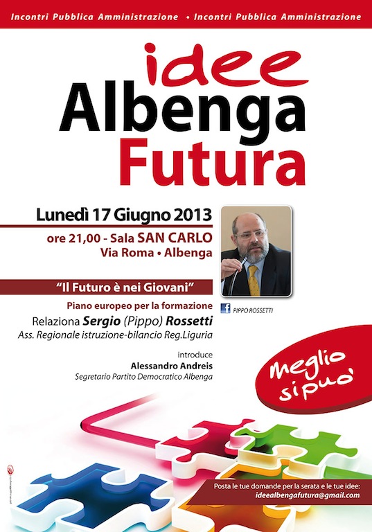 Dopo sicurezza e senso civico, raccolta differenziata spinta, viabilità e mezzi di trasporto alternativi all’auto, oggi i temi saranno formazione ed inserimento nel mondo del lavoro per i giovani, con la presenza di Pippo Rossetti ( Assessore al Bilancio della Regione Liguria).