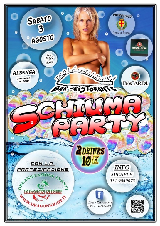 Tutto pronto per il primo “Schiuma Party” della storia di Albenga, attesa iniziativa nel calendario delle manifestazioni estive dell’Assessorato al Turismo, che si svolgerà Sabato 3 Agosto sul lungomare Andrea Doria, dalle ore 23.00 alle ore 05.00, a cura del Bar Ristorante Isola Gallinara, con il patrocinio del Comune di Albenga. Musica, animazione, divertimento e tanta, tantissima schiuma.