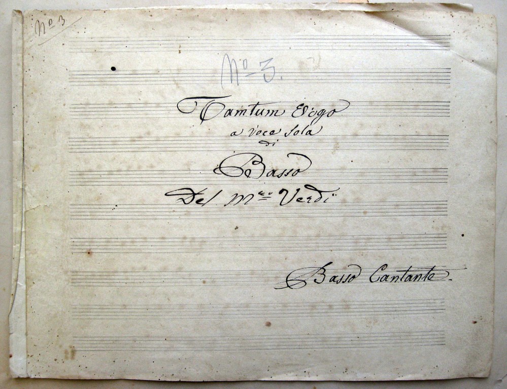 Il ritrovamento dell’inedito di Verdi è stato effettuato dai musicologi Flavio Menardi Noguera e Italo Vescovo durante il riordinamento - ancora in corso – del fondo di musiche manoscritte depositato nel 2005 dalla Filarmonica di Finalborgo presso la Sezione Musicale di Conservazione della Biblioteca Mediateca Finalese. Si tratta di una composizione “giovanile” di Verdi risalente, con tutta probabilità, al 1839, anno in cui il compositore musicò la romanza l’Esule il cui tema è utilizzato nel Tantum Ergo, scritto per voce di basso/baritono e orchestra.