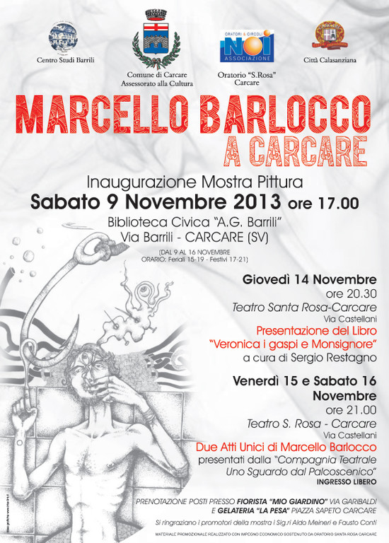 Carcare dal 9 al 16 novembre sarà protagonista di un originalissimo percorso, insieme di riscoperta e valorizzazione di un suo singolare cittadino. “Marcello Barlocco a Carcare” è il titolo di una rassegna d’arte, letteratura e teatro, ma il titolo non esprime esattamente lo stato delle cose. Marcello Barlocco ha vissuto “il borgo”, lo ha studiato, psicanalizzato, interpretato, percorso in tutte le sue direzioni, fisiche e metafisiche. Oggi, quando la maggior parte dei carcaresi ne ignora l’esistenza e l’operato letterario, “Marcello risorge a Carcare”.