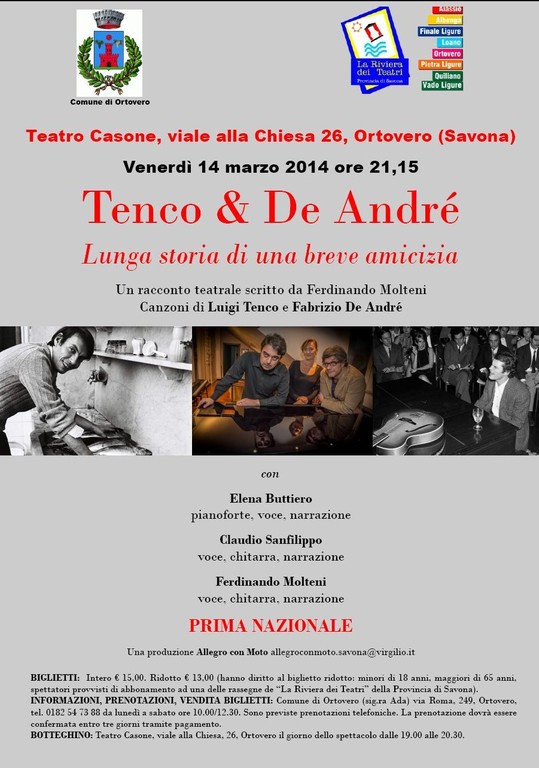 Debutterà venerdì 14 marzo, alle 21,15, al Teatro Casone di Ortovero, il recital “Tenco & De André - Lunga storia di una breve amicizia”.