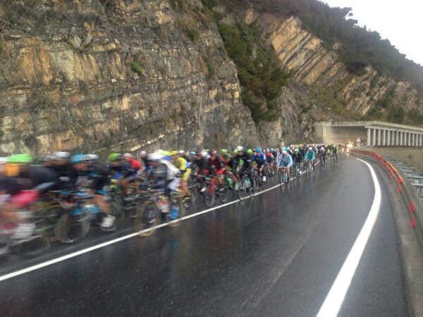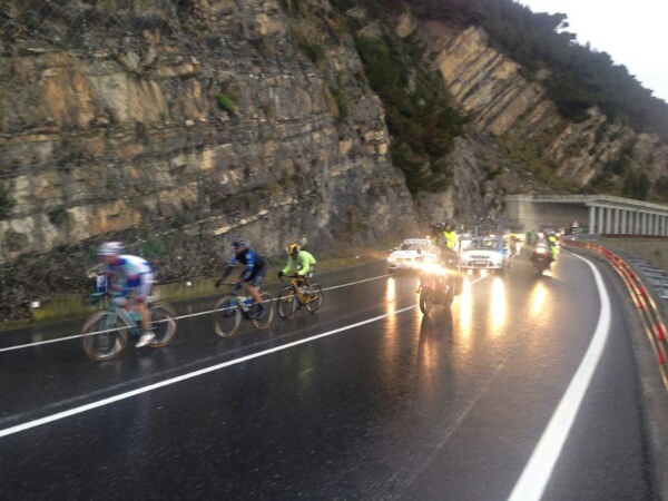 I ciclisti hanno varcato il confine tra Piemonte e Liguria intorno alle 12:45 e intorno alle 13 sono arrivati nei pressi di Rossiglione, dove i fuggitivi hanno 10'30' di vantaggio sul gruppo. Purtroppo il meteo è peggiorato nelle ultime ore, rispetto alla partenze e sul Turchino e previsto maltempo. Le condizioni dovrebbero però migliorare una volta scavallato ed iniziata la discesa verso la Riviera.