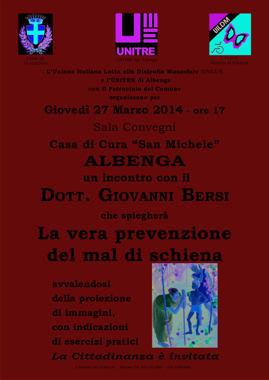 Giovedi 27 marzo alle ore 17 presso la Casa di Cura S. Michele di Albenga, si terrà un incontro con il Dott. Giovanni Bersi.