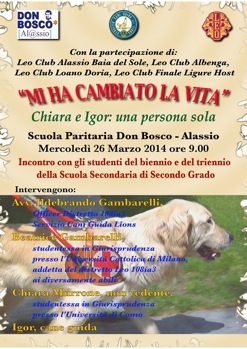 "Mi ha cambiato la vita. Chiara e Igor: una persona sola". Questo il titolo dell'incontro organizzato dalla Scuola Paritaria Don Bosco di Alassio, con la partecipazione dei Leo Club di Alassio Baia del Sole, Finale Ligure Host, Albenga e Loano Doria, che si svolgerà nell'auditorium dell'Istituto Salesiano "Madonna degli Angeli" di Alassio Mercoledì 26 Marzo 2014 alle ore 9.00. Un incontro con gli studenti del biennio e del triennio della Scuola Secondaria di Secondo Grado, a conclusione di una serie di conferenze che si rivolgono ai giovani, al fine di far conoscere realtà differenti e sensibilizzarli al sociale.