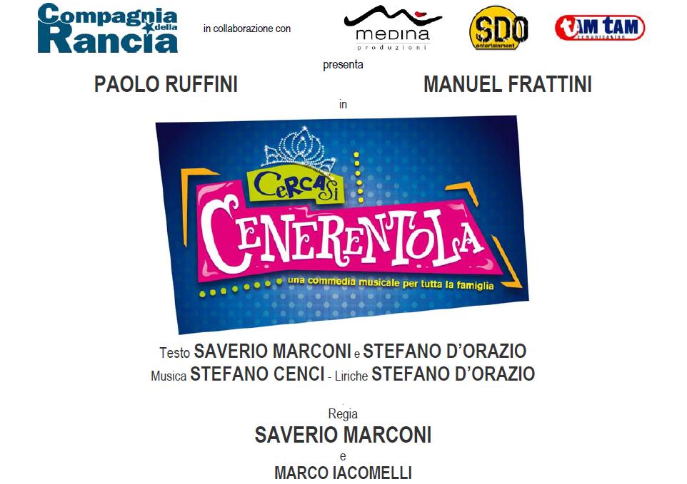 Paolo Ruffini e Manuel Frattini sono i protagonisti di “Cercasi Cenerentola”, la commedia musicale per tutta la famiglia, prodotta dalla Compagnia della Rancia, che andrà in scena lunedì 7 aprile, alle ore 21, al Cinema Teatro “Guido Moretti” di Pietra Ligure. Il testo è di Saverio Marconi e Stefano D’Orazio. Musica di Stefano Cenci. Liriche di Stefano D’Orazio. Regia di Saverio Marconi e Marco Iacomelli.