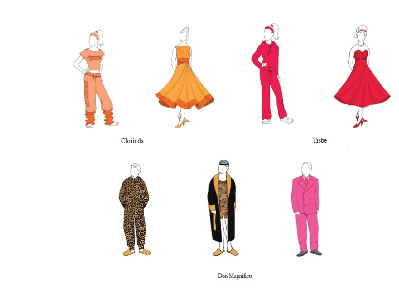 Don Magnifico indossa un pigiama leopardato, Dandini il cameriere arriva con kefiah e occhiali scuri, Alidoro, saggio tessitore di trame, sfoggia un abito blu elettrico stile charleston, cilindro e scarpe con le ghette.