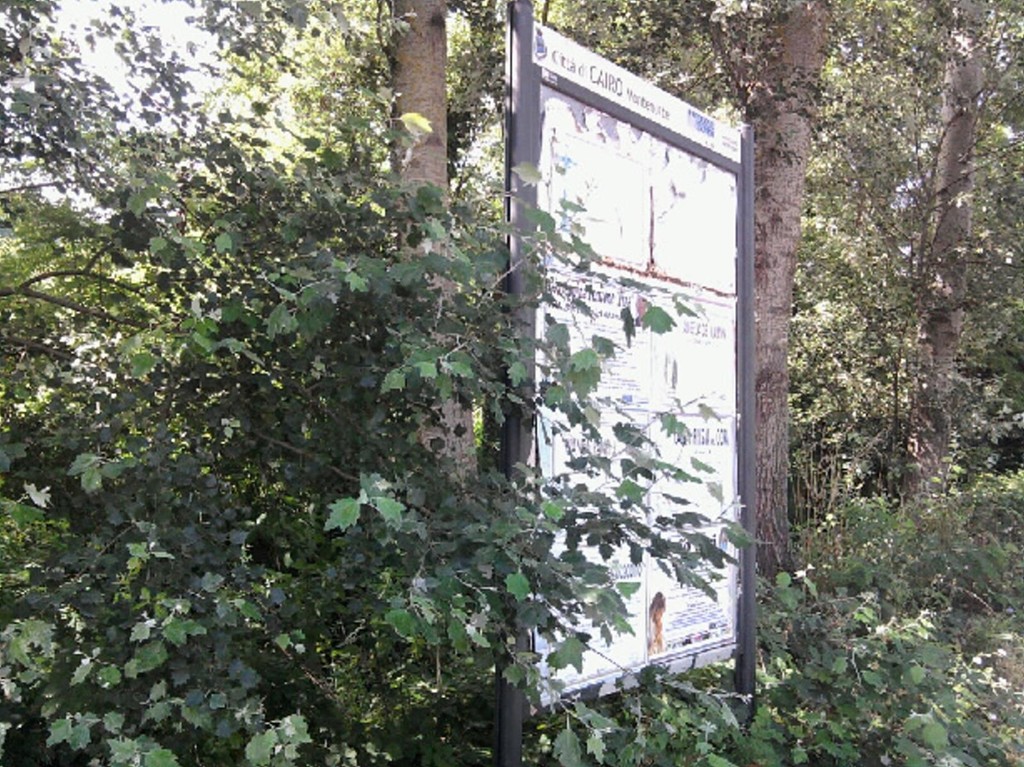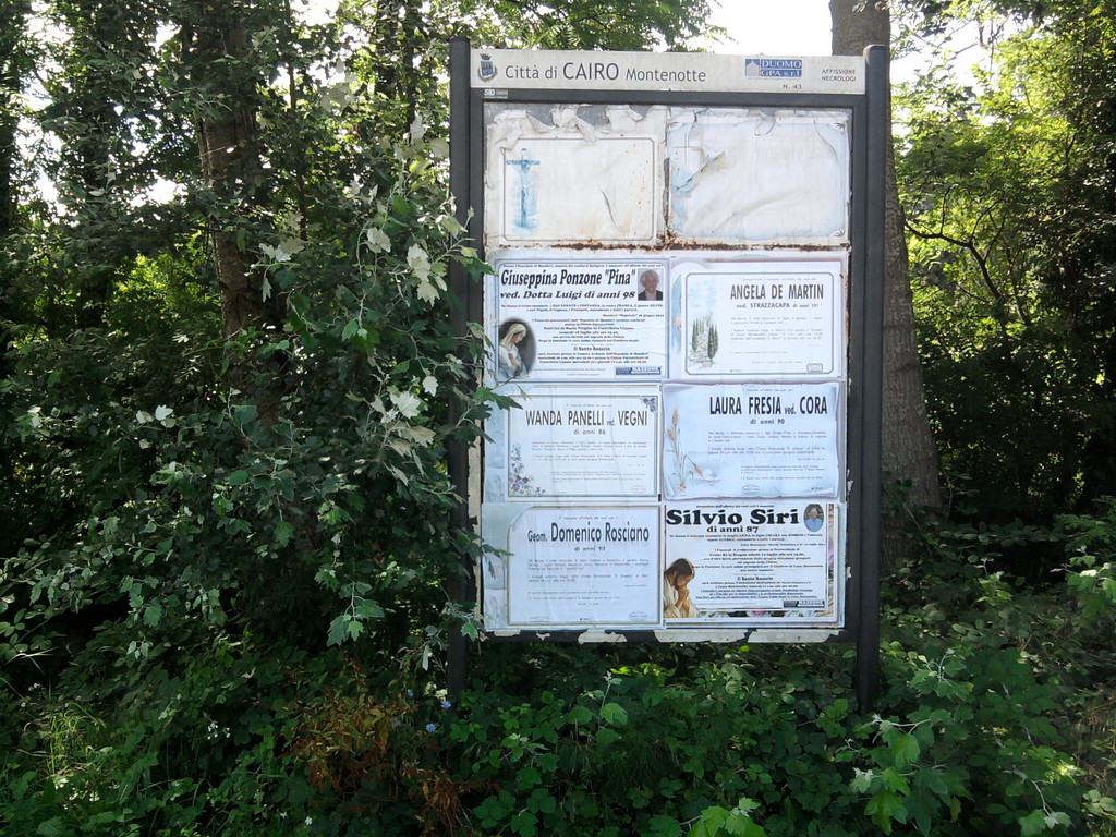 In località Ferrere, presso il comune di Cairo Montenotte, l’erba alta e alcuni alberi sporgenti rendono poco visibile uno dei tabelloni per l’affissione dei necrologi.