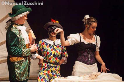 Ultima non ultima è Arlecchino. L’inserimento del celeberrimo personaggio (peraltro poco o nulla amato dal Goldoni, in quanto retaggio di quella Commedia dell’Arte che fu la causa scatenante della sua riforma del teatro comico), potrebbe a prima vista apparire come una forzatura sul testo, ma quando si attinga direttamente dal Truffaldino del Servitore di Due Padroni, ecco che tutto rientra nel solco della grande tradizione dell’universo goldoniano.