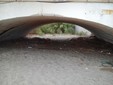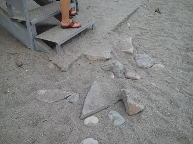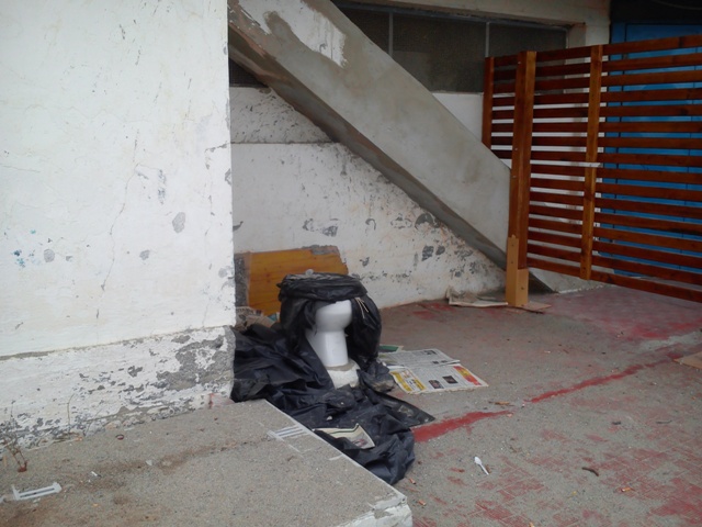 Doccia addossata al muro con muffa, strutture abbandonate sulla spiaggia, pezzi di cemento, bisogni di cani nella zona sotto il ponte