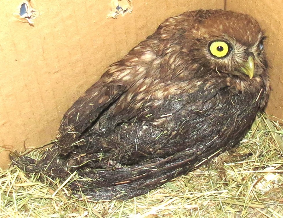 Affamata, disidratata e sofferente, è stata salvata dalle cure dei volontari ma ci vorranno lunghe spugnature con solventi per liberarla; purtroppo molte penne e piume sono irrimediabilmente rovinate e, poiché la muta annuale è già finita, questo esemplare dovrà rimanere quasi un anno in voliera per attendere la formazione delle nuove penne, condizione indispensabile per poterlo rimettere in libertà.