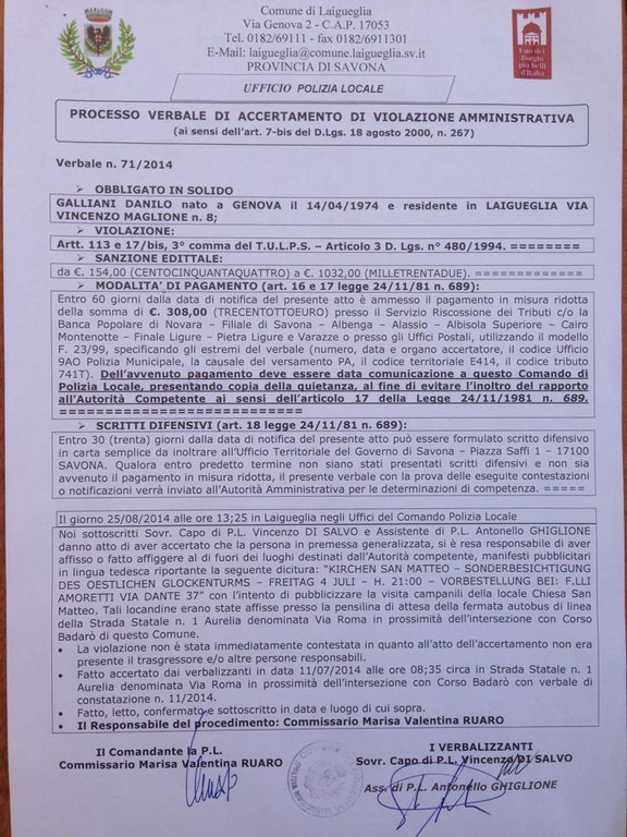Don Danilo Galliani, arciprete della Parrocchia di San Matteo, si è visto recapitare ieri un verbale di accertamento di violazione amministrativa da ben 308 euro. Il reato contestato? Come si legge nel documento notificatogli aver affisso dei manifesti in lingua tedesca, per pubblicizzare la visita ai campanili della chiesa, alla pensilina della fermata autobus sulla via Aurelia, all’incrocio con corso Badarò. A raccontare la vicenda, e coniare il titolo, è direttamente lo stesso Don, tramite la pagina facebook della Parrocchia di San Matteo.