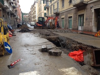 Lavori in corso in via Milano a Savona. L'intervento è stato reso necessario a causa di un cedimento strutturale della canalizzazione delle acque bianche, all’altezza del civico n. 1, provocato dalle forte piogge cadute lo scorso 15 novembre.