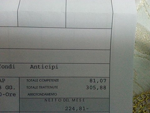 Si, perché le trattenute superano di gran lunga le competenze e così l’assurdità, 224 euro dovuti all’azienda, è indignazione e rabbia per chi non sa darsi più una risposta per quanto accade.