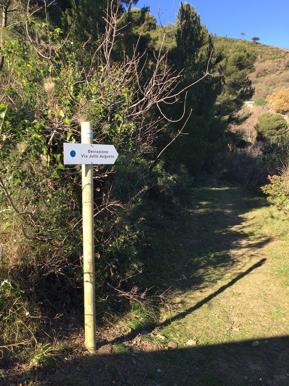La deviazione (lunga circa 2 chilometri) parte a circa 500 metri dopo la chiesa di Sant’ Anna e ritorna sulla Via Iulia Augusta un po’ prima di Monti e Mare passando attraverso un sentiero interpoderale con bellissime viste sulle colline e sul mare.