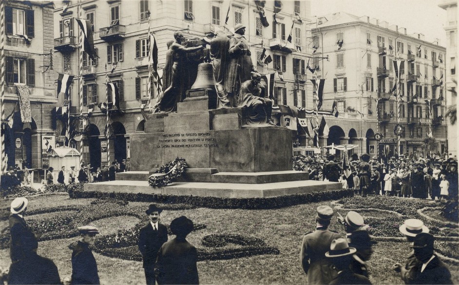 Nella primavera successiva sorse il basamento in sienite della Balma e nell’estate del 1926, la scultura in bronzo, venne posta in piazza Mameli, ancora nascosta agli occhi di tutti. Passò più di un anno ed alla fine di agosto del 1927, il re, Vittorio Emanuele III, accettò l’invito per venire a Savona ed inaugurare il monumento. La cerimonia venne fissata per il 18 settembre. Sul lato della Banca d’Italia fu allestito il palco reale e tutta la piazza fu divisa in settori destinati a varie categorie. Il re giunse alla stazione alle 9, accompagnato dal ministro della Pubblica Istruzione.