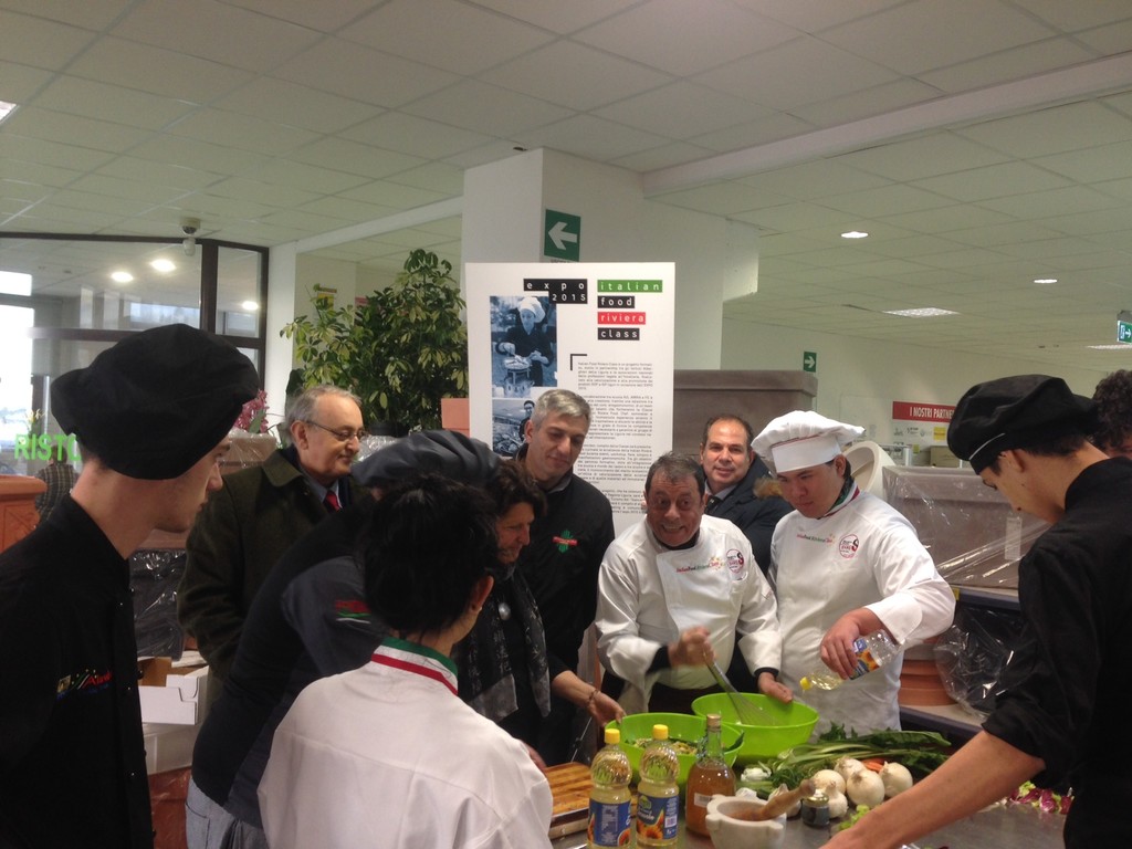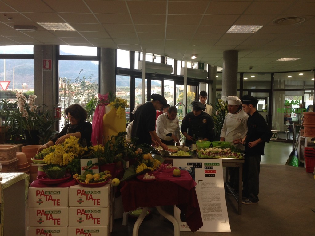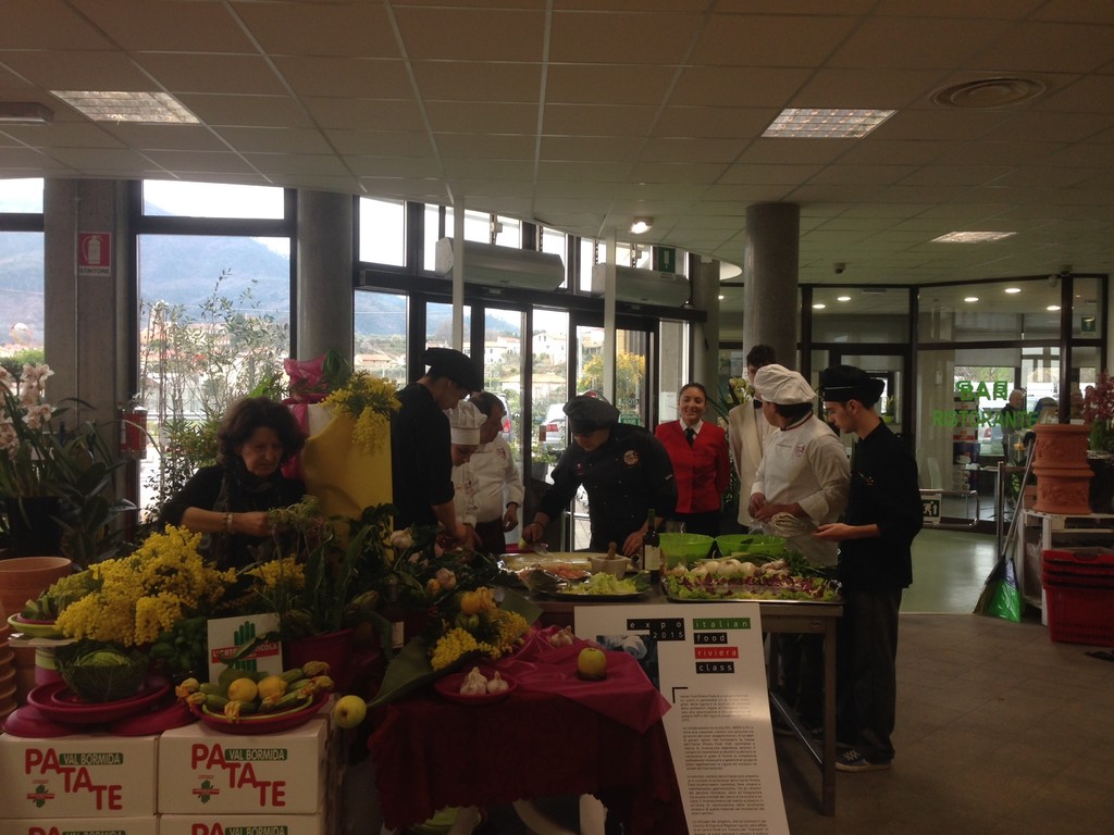 Questa mattina, nell'Ortoshop della Cooperativa L'Ortofrutticola di Albenga, si è svolta una performance di “Arte & Food”, l'iniziativa comune dei progetti “T3rra” del Centro Culturale Paraxo e “Italian Food Riviera Class” dell'Istituto Alberghiero Giancardi di Alassio in vista dell'Expo 2015. Nell’ambito dell'evento la pittrice e scultrice ligure Renza Sciutto ha intrattenuto i clienti dell'Ortoshop con una esibizione artistica, mentre i giovani talenti di Italian Food Riviera Class Expo –Scuola 2015 Nico Gazzano, Piercarlo Alizeri, Miriana Aria Palermo, Riccardo Gareffi, Shijie Ye, coordinati da Renato Grasso (presidente della federazione italiana cuochi della Liguria) hanno preparato veri e propri capolavori culinari con olio, vino e altre leccornie prodotte nella piana albenganese e nelle zone limitrofe.Dopo un lungo lavoro di organizzazione, i dirigenti della Cooperativa albenganese sono riusciti a realizzare una sorta di minimaket all’interno dell’Ortoshop, dove, i clienti tra una consultazione specialistica degli agronomi e gli acquisti per campagne o giardini domestici possono fare la spesa prima di rientrare a casa.Quotidianamente, infatti, sugli scaffali del nuovo reparto, oltre a frutta e verdure di stagione fresche di giornata, si trovano tutte le varietà di legumi secchi di provenienza italiana, vini, birra ed olii liguri selezionati, pane e altri prodotti da forno confezionati, e recentemente anche salumi e formaggi liguri e delle zone limitrofe che hanno ottenuto il marchio di qualità, oltre ad alcuni prodotti che soddisfano le esigenze dei vegani.