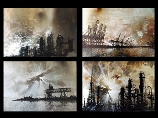 Continua “In questi mesi ho "sviscerato" quest'urgenza espressiva: mi sono immerso in un universo laterale, ho raccolto impressioni, ricordi, prospettive. Ho ricercato i materiali consustanziali a questi luoghi perduti, raccogliendone le diverse tecniche di lavorazione, inventandone e sviluppandone altre. Sono passato dalle ruggini del ferro logorato dal tempo agli ossidi ricreati con processi alchemici, ho imparato a dipingere con il fuoco sugli acciai scuri, ho tentato di disegnare con la luce dei riflessi abbaglianti dell'alluminio, ho inciso lo zinco con acidi colorati, smalti industriali, fiamme ossidriche”.