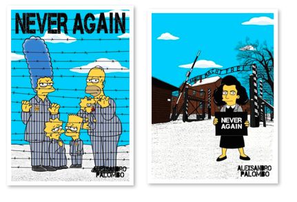 In questa triste ricorrenza, una realtà non convenzionale e dissacrante come quella dei Simpson è stata utilizzata grazie al proprio seguito per dire : “Never Again”. Marge, Homer e il resto della famiglia, vengono ritratti assieme ad Anna Frank, in occasione del suo settantesimo anniversario, smagriti e con il “pigiama a righe”, dietro al filo spinato.