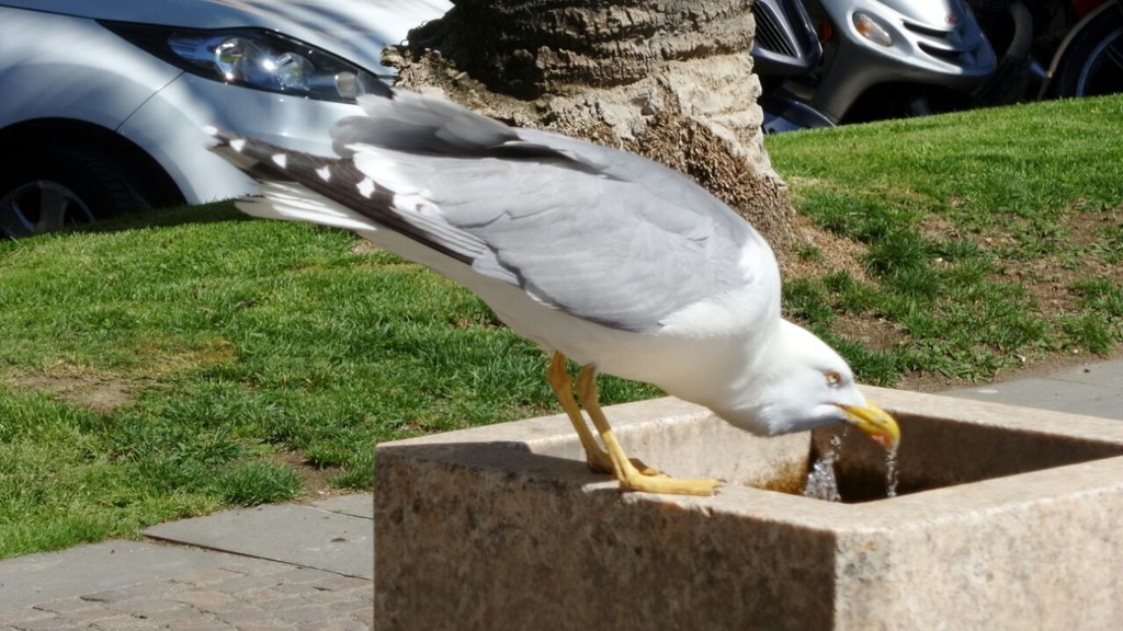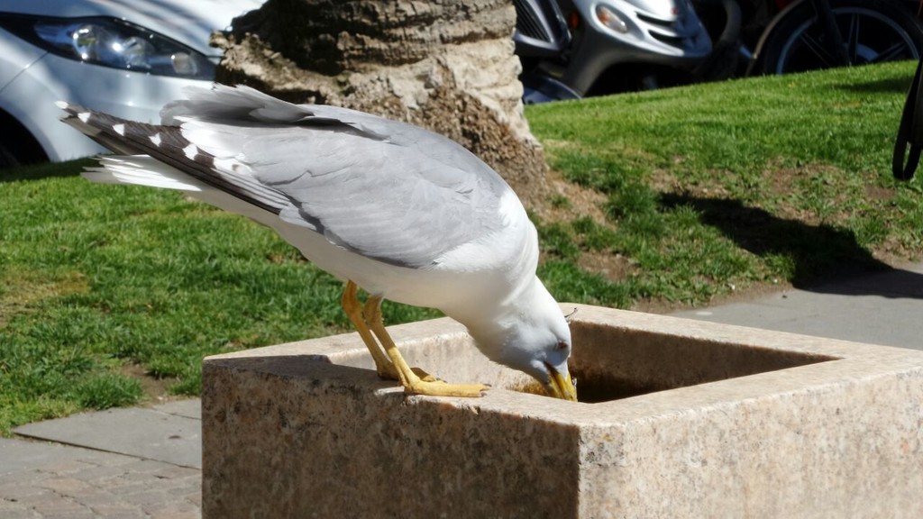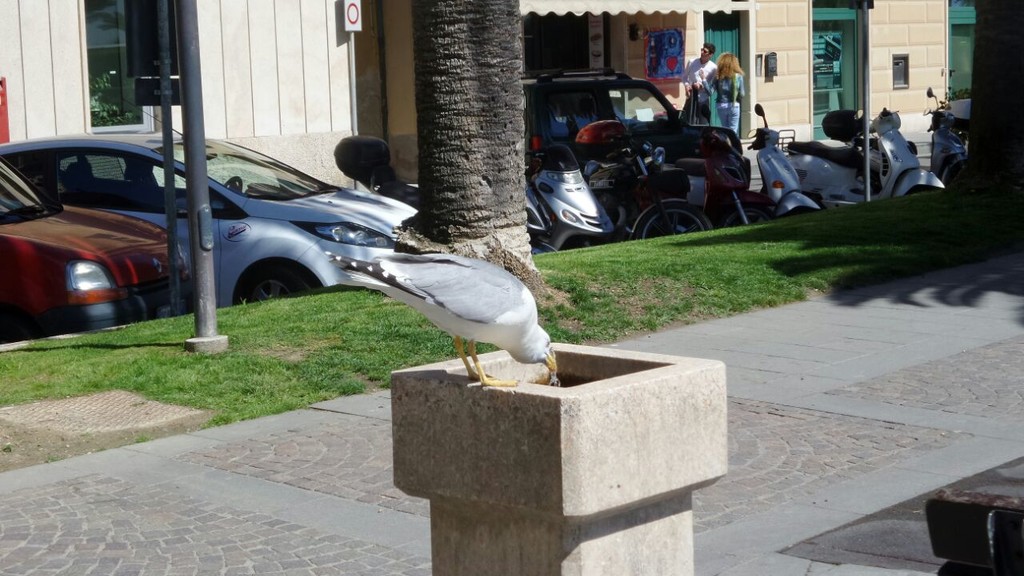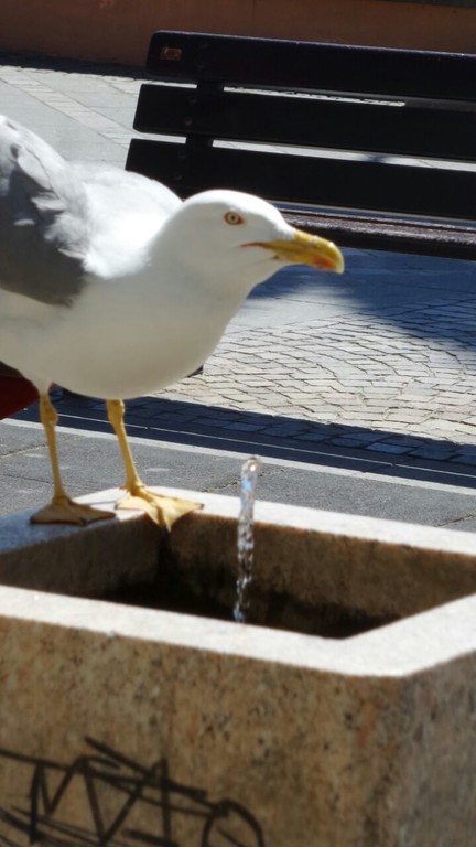 Ecco dunque a Finale un bell’esemplare di gabbiano bere tranquillo alla fontanella della piazza vicino alla posta sebbene qualche passante un po’ intimorito abbia deciso di passare alla larga dall’animale