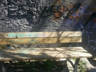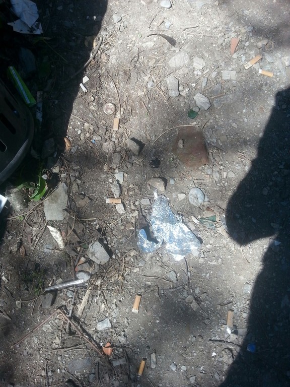Appena varcato il cancello però la situazione peggiora. La panchina ed il muro retrostante sono completamente coperti di graffiti, ma questo non è sicuramente il problema principale. L’area risulta infatti quasi completamente invasa da cocci di bottiglia di birra, taglienti pezzi aguzzi che rischiano di conficcarsi nelle zampe dei cani e ferirli seriamente.