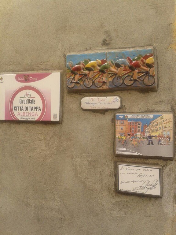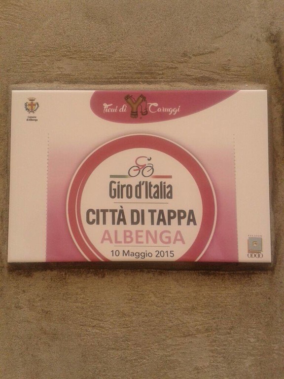 E' stata inaugurata questa mattina alle ore 11 in vico del Collegio presso la cantina dei Fieui di Caruggi , alla presenza di Autorità, ciclisti ed appassionati, la piastrella ufficiale del Giro d’Italia realizzata a cura del Comune di Albenga, della Fondazione Oddi e degli stessi Fieui.