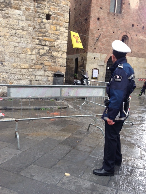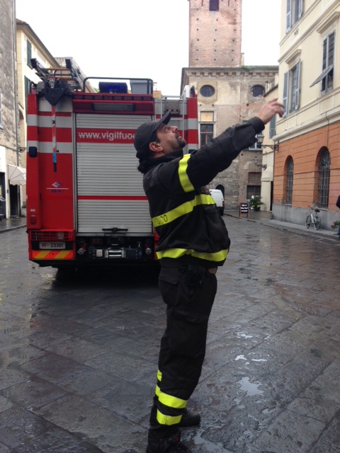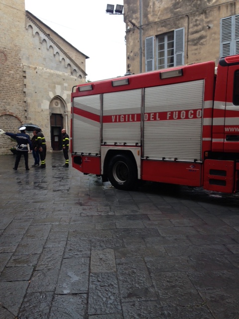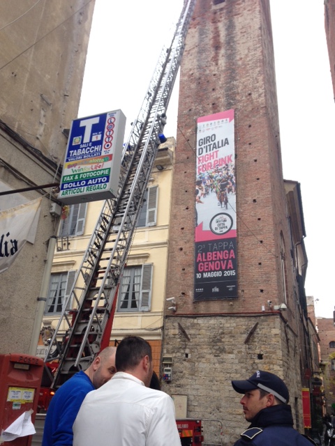 Intervento dei Vigili del Fuoco in Piazza San Michele ad Albenga per la caduta di calcinacci da una delle tre torri simbolo della città.