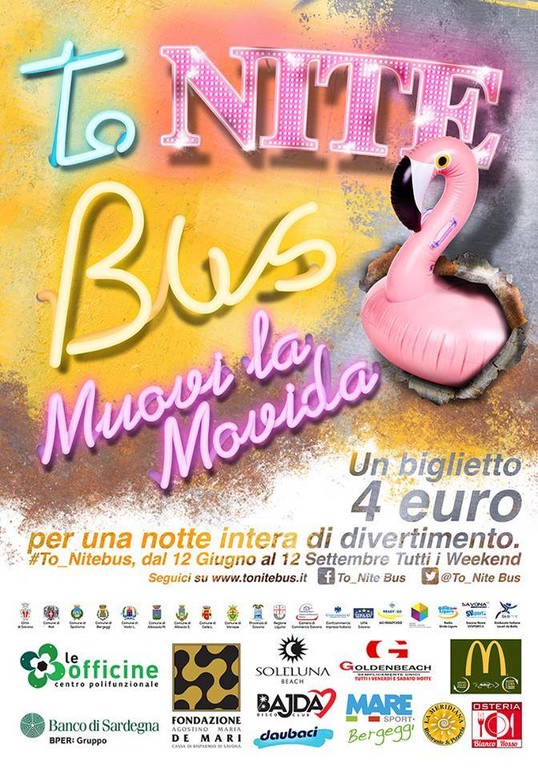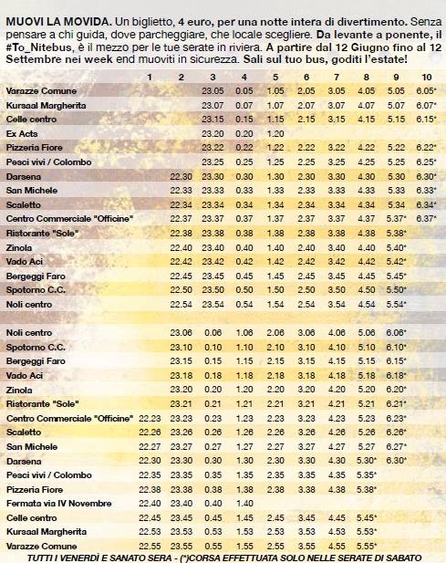 Dopo il successo dello scorso anno, ritorna, esteso nel tempo e potenziato nella promozione, il To_Nite Bus, il servizio serale di bus a biglietto unico alla tariffa di 4 euro, andata e ritorno, che, per soli 4 euro, consente di viaggiare e spostarsi in sicurezza al venerdì e al sabato, sul tratto di costa compreso tra Noli e Varazze.