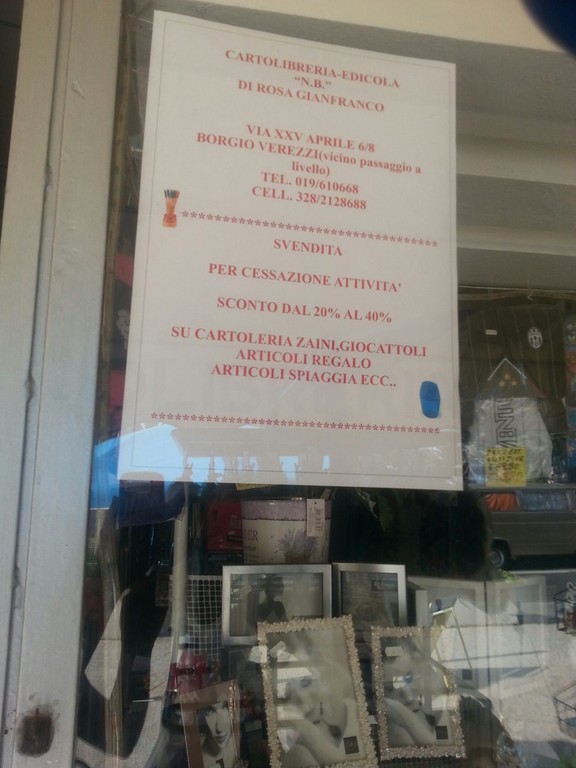 Da diverse settimane fuori dalla porta della cartoleria è comparso il seguente cartello:”Svendita per cessazione attività, sconto dal 20% al 40% su giocattoli, zaini, articoli regalo e spiaggia”. “Sono tre anni, spiega il proprietario, che gestisco questa attività. Io sono già in pensione, ma ho deciso di lanciarmi in questa nuova avventura, che purtroppo non è andata bene”. “Io ho moltissima esperienza nel settore di servizi al pubblico: per anni ho avuto un albergo a Pietra Ligure. Al di là dei problemi legati alla grave congiuntura economica, spiega l’uomo, capita anche che chi abiti qua decida di andare a fare le commissioni a Pietra e Finale Ligure". Una mancanza di campanilismo degli stessi residenti, lamentate anche da altri negozi.