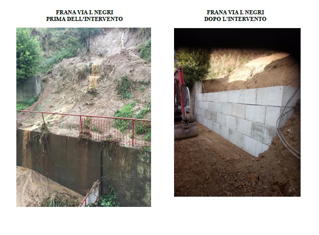 - Intervento sul movimento franoso sul retro condominio Via I.Negri con sistemazione opera provvisionale costituita dalla posa in opera di blocchi di calcestruzzo per costituire una barriera adeguata a prevenire eventuali futuri scivolamenti di nuovo terreno ;