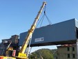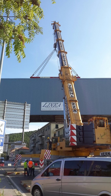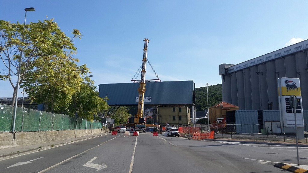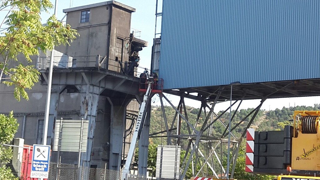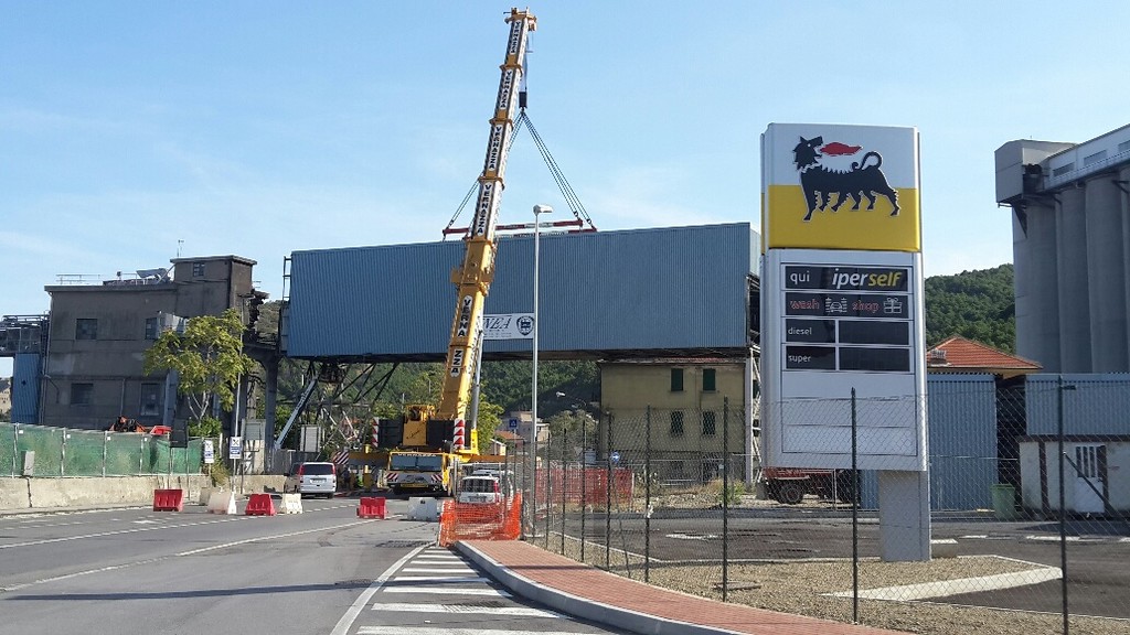 Ieri si è proceduto a rimuovere due dei tre pezzi laterali, di 35 tonnellate cadauno, che costituiscono il nastro trasportatore. Le parti sono state prima imbragate con tutte le protezioni di sicurezza, cavi e catene, poi tagliate con la fiamma ossidrica e poi depositate a terra, dove verranno ulteriormente ridotte per il trasporto. Oggi invece, è stato tolto il tronco centrale, collocato al di sopra della via Aurelia. Domani, per concludere le operazioni, si procederà con la rimozione dell'ultimo cassone.