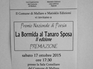 Si è tenuta sabato 17 ottobre, nella sala consiliare del Comune di Mallare (SV), l'appuntamento conclusivo dell'edizione 2015 del Premio Nazionale di Poesia "La Bormida al Tanaro Sposa", organizzato dalla casa editrice Matisklo Edizioni e giunto quest'anno alla seconda edizione.