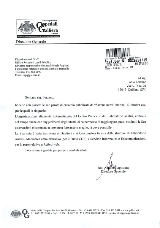 Paolo Forzano ha ricevuto una lettera di ringraziamento da parte di Adriano Lagostena, Direttore Generale dell'Ente Ospedaliero Ospedali Galliera per le sue parole di encomio pubblicate lo scorso 13 ottobre sul nostro sito www.savonanews.it circa il Centro Prelievi e il Laboratorio Analisi.
