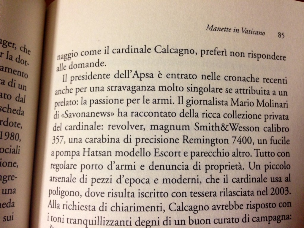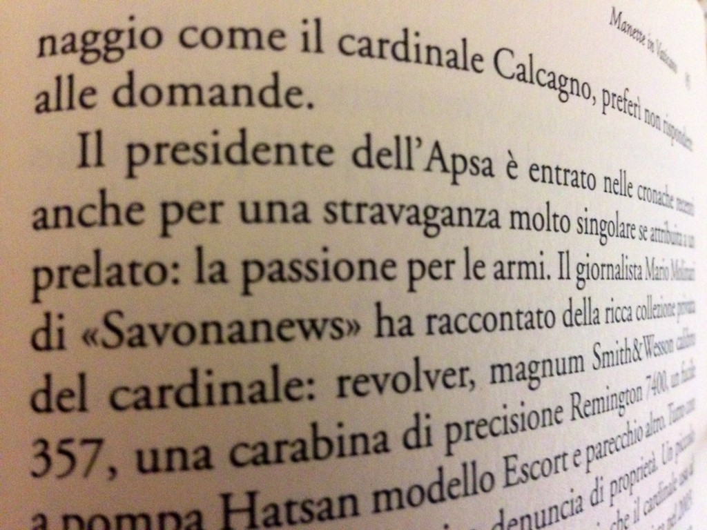 Nuzzi infatti riprende anche alcune testimonianze del savonese Francesco Zanardi, presidente della Rete “L’Abuso”, sui casi di pedofilia nella diocesi savonese. A pagina 83 Nuzzi scrive: “Ad avvisare l’allora vescovo ci fu anche una vittima di abusi, Francesco Zanardi. Ecco la sua testimonianza: “Calcagno… mi disse di non recarmi alla magistratura, in quanto il prete era una persona molto fragile e avrebbe potuto suicidarsi e io l’avrei poi avuto sulla coscienza”. Si parla del Cardinale Domenico Calcagno, e la versione di Zanardi è sostenuta dalla testimonianza di don Carlo Rebagliati, il quale aveva anch’egli dichiarato, prima di morire in circostanze misteriose, di aver segnalato le malefatte del prete pedofilo all’allora vescovo della diocesi di Savona, sentendosi rispondere: "Potevano anche essere solo dicerie". Nuzzi riporta l’episodio nel capitolo “Il Cardinale Rambo”, sempre riferito all’attuale presidente dell’A.p.s.a. (Amministrazione del patrimonio della Sede Apostolica), che nell’aprile del 2012 subisce ancora un affronto da parte di Francesco Zanardi. Ne “L’arsenale del Cardinale” infatti si riporta la notizia, in modo dettagliato, della collezione di fucili, alcuni dei quali “destinate dal fabbricante ad usi offensivi”, che il Cardinale aveva anche regolarmente denunciato. “Mi piacciono le armi, che male c’è”, si era difeso qualche giorno dopo dalle pagine di Repubblica. E alle domande del giornalista aveva risposto: “Ho pensato che la notizia della diffusione delle mie armi possa essere legata a quelle vicende”. Quelle di quasi dieci anni prima, quando alcune vittime di abusi e alcuni preti lo avevano fortemente accusato di non aver contrastato il fenomeno della pedofilia anche laddove era stato messo a conoscenza. Due pagine più tardi, Gianluigi Nuzzi menziona il giornalista di Savona News, Mario Molinari, firmatario dell’articolo che rivelò appunto al mondo la passione per le armi di Cardinal Calcagno.
