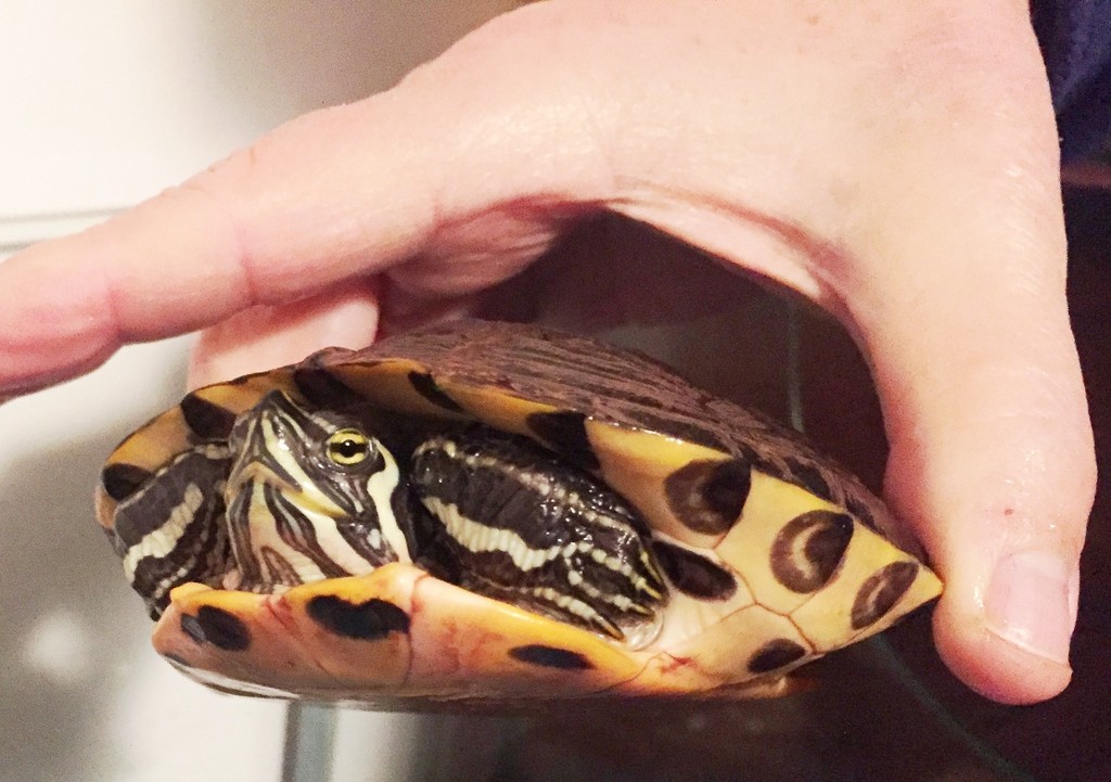 Non può più tenere in modo soddisfacente una tartaruga acquatica esotica (orecchie gialle) ed invece di abbandonarla per strada o in campagna, come fanno molte persone lancia un appello per trovarle una nuova famiglia adottiva.