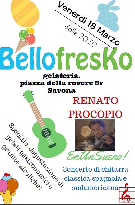 Venerdì 18 Marzo dalle 20.30 , in occasione della festa patronale di Savona, potrete Assistere al concerto di chitarra classica del Maestro Renato Procopio dal titolo "En Un Sueno" ,sonorità dalla Spagna e dal SudAmerica,il tutto accompagnato da Granite Alcoliche e gelati gastronomici salati.