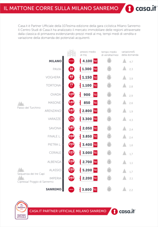 In occasione della 107a edizione della Milano-Sanremo in programma il 19 marzo 2016, Casa.it, partner ufficiale, ha analizzato l’andamento del mercato immobiliare nelle città attraversate dalla gara, evidenziando i prezzi medi al mq, i tempi medi di vendita, le variazioni di prezzo e della domanda.