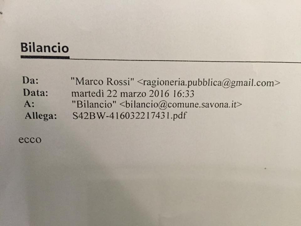 Le firme dei revisori dei Conti Marco Rossi e Paolo Trucco (due su tre) sono giunte dopo la sospensione: i due pareri sono stati favorevoli all'emendamento che agevola del 5% sulla Tari i commercianti, ma dalla minoranza é stato richiesto un chiarimento e il documento che testimonia che le firme dei revisori sono giunte in maniera telematica. La seduta é stata nuovamente interrotta e successivamente la maggioranza ha fornito ai consiglieri una fotocopia della mail con la firma dei revisori che però, non ha soddisfatto la minoranza (vedi foto): "Non ha valore una mail che non sia di posta certificata (ma da Gmail) con uno screen shot", é intervenuto il consigliere di Fratelli d'Italia, Alessandro Parino. "La pratica non era completa all'inizio della discussione, non può essere valida", ha affermato Ileana Romagnoli di Forza Italia. "I selfie non fanno ancora parte della pubblica amministrazione", ha affermato il consigliere leghista Massimo Arecco. “La pratica attualmente in discussione è palesemente incompleta. L'azione della maggioranza è scorretta. Non si può presentare una pratica (soprattutto su un argomento così importante) senza che sia formalmente completa. È un esempio di superficialità non accettabile”, incalza Daniela Pongiglione di Noi per Savona. "Le pratiche che influiscono sulle entrate del Comune devono per legge avere il parere dei revisori dei conti - affermano dal M5S - Per poter verificare la validità delle firme dei revisori sul documento avrebbero dovuto inviarci il documento digitale. Ci hanno invece consegnato due pezzi di carta, uno con la stampa della foto dello schermo del computer e l'altro con la stampa di un'email Gmail con il testo "ecco". Uno squallido spettacolo di fine mandato. Lo sconto del 5% sulla tassa dei rifiuti a bar, ristoranti e ortofrutta non è altro che una marchetta elettorale del PD per promettersi i voti di alcune categoria".