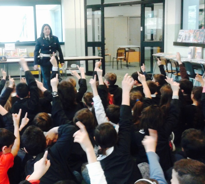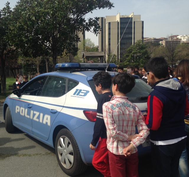 Molte le mani alzate tra i bambini per domande e curiosità ma anche per chiedere consigli di vita quotidiana. Il momento culminante è stato quando i bambini nel cortile della scuola hanno potuto osservare da vicino l’autovettura della Squadra Volante.