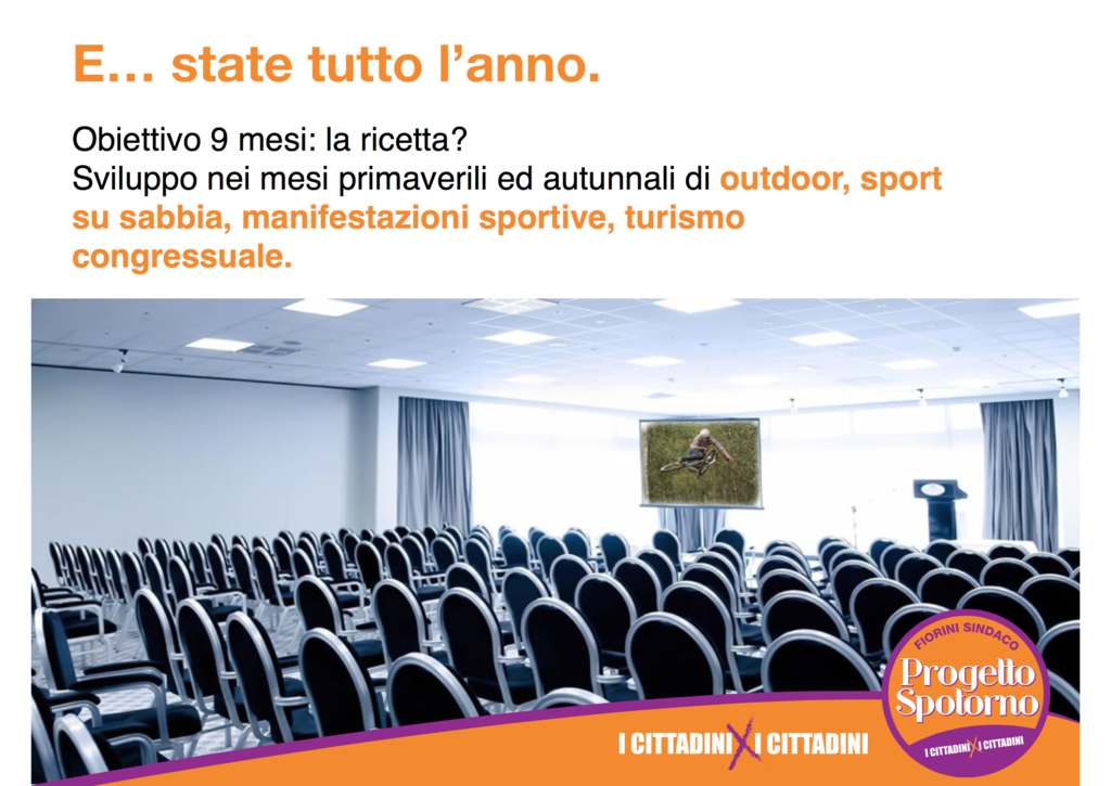 Abbiamo un obiettivo ben preciso: portare gradualmente la stagione turistica dagli attuali 3-4 mesi a 9. Per ottenere questo risultato valorizzeremo le risorse che il nostro territorio ci offre: gli sport dell’outdoor, come il biking, il trekking, quelli legati al mare come la vela ed il diving, gli sport su sabbia come il volley ed il soccer per non dimenticare l’elioterapia. Ci impegneremo per trovare le risorse per migliorare le manifestazioni già in calendario, come Festival del Vento e Swim Theisland e per ospitarne di nuove. Una strada nuova da percorrere è quella del turismo congressuale, in quanto la Sala Palace, potrebbe ospitare, per circa 7 mesi all’anno (esclusi quelli estivi ed il Natale) congressi medico-farmaceutici, portando nei week end più di 100 dottori a Spotorno